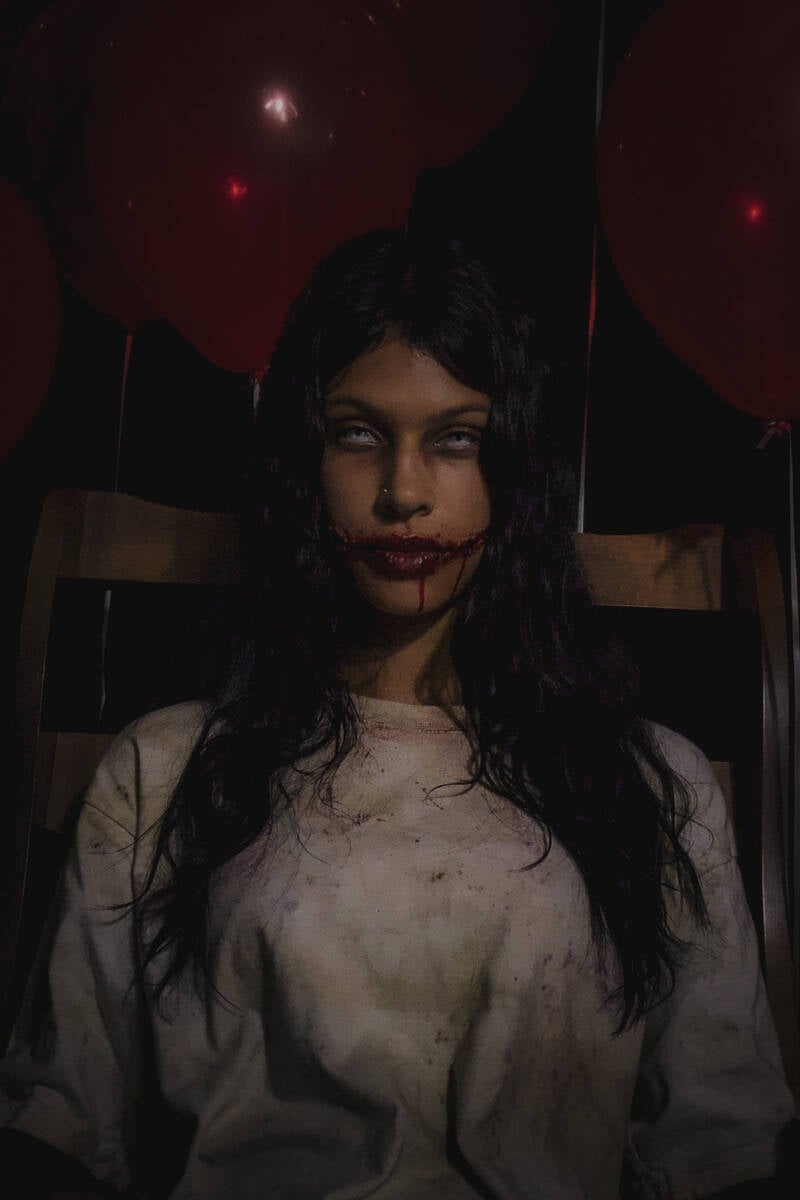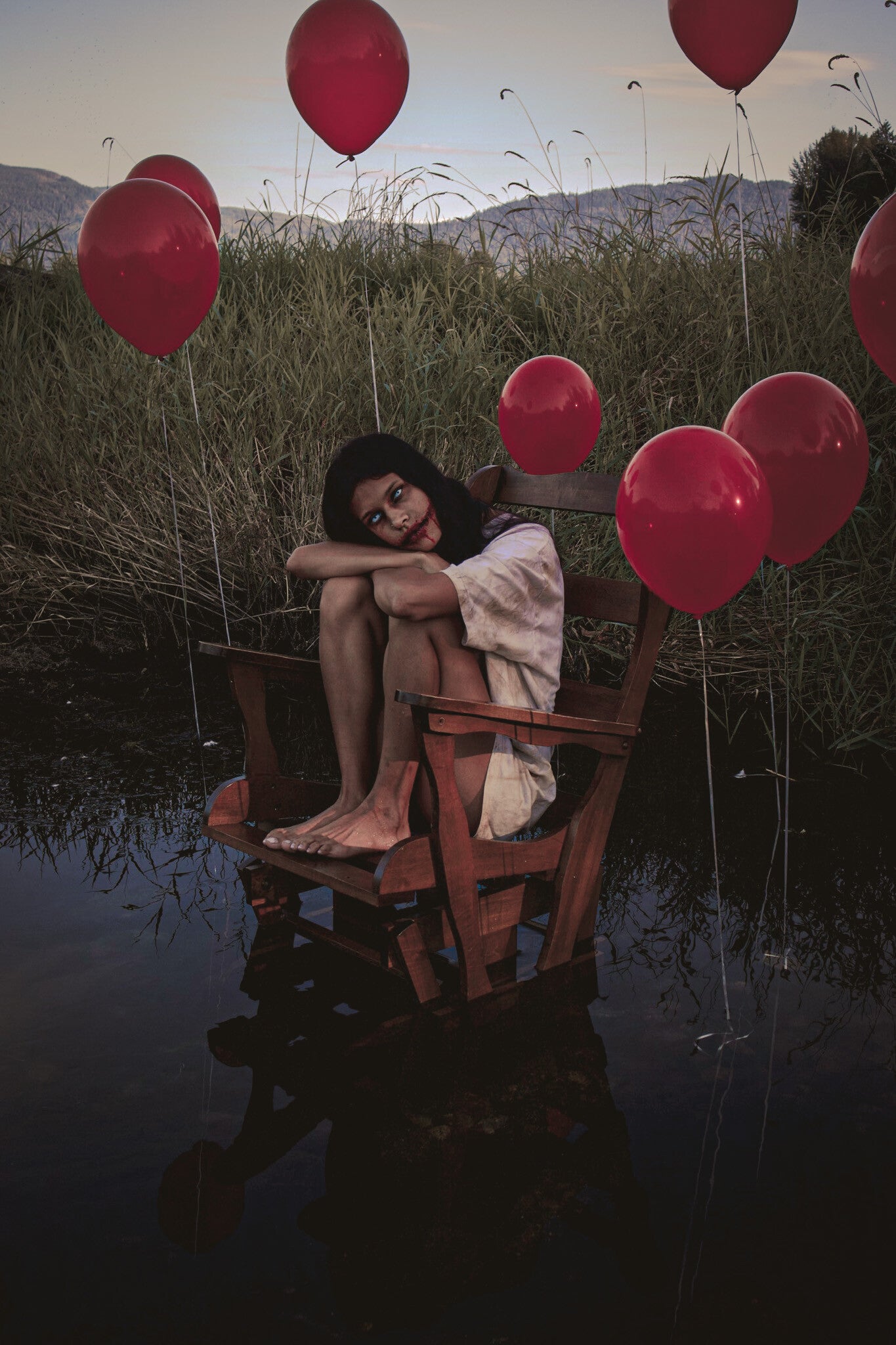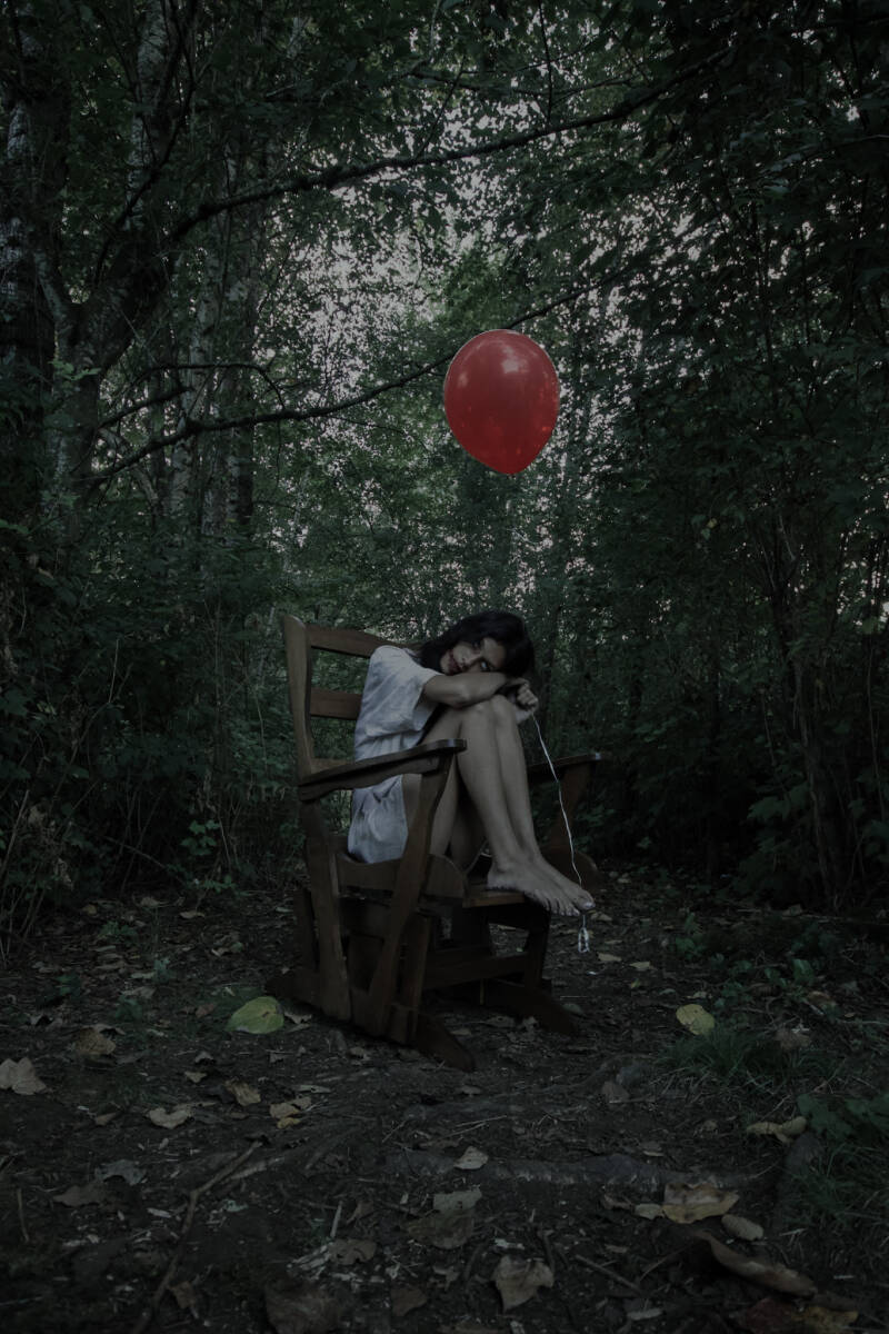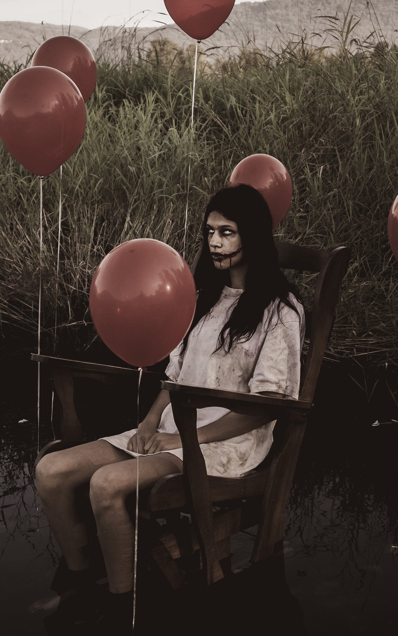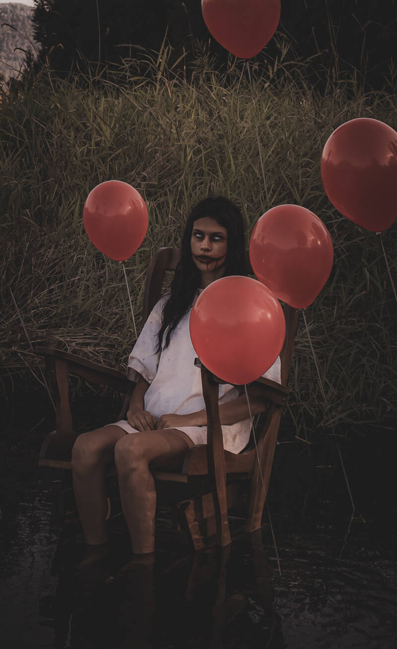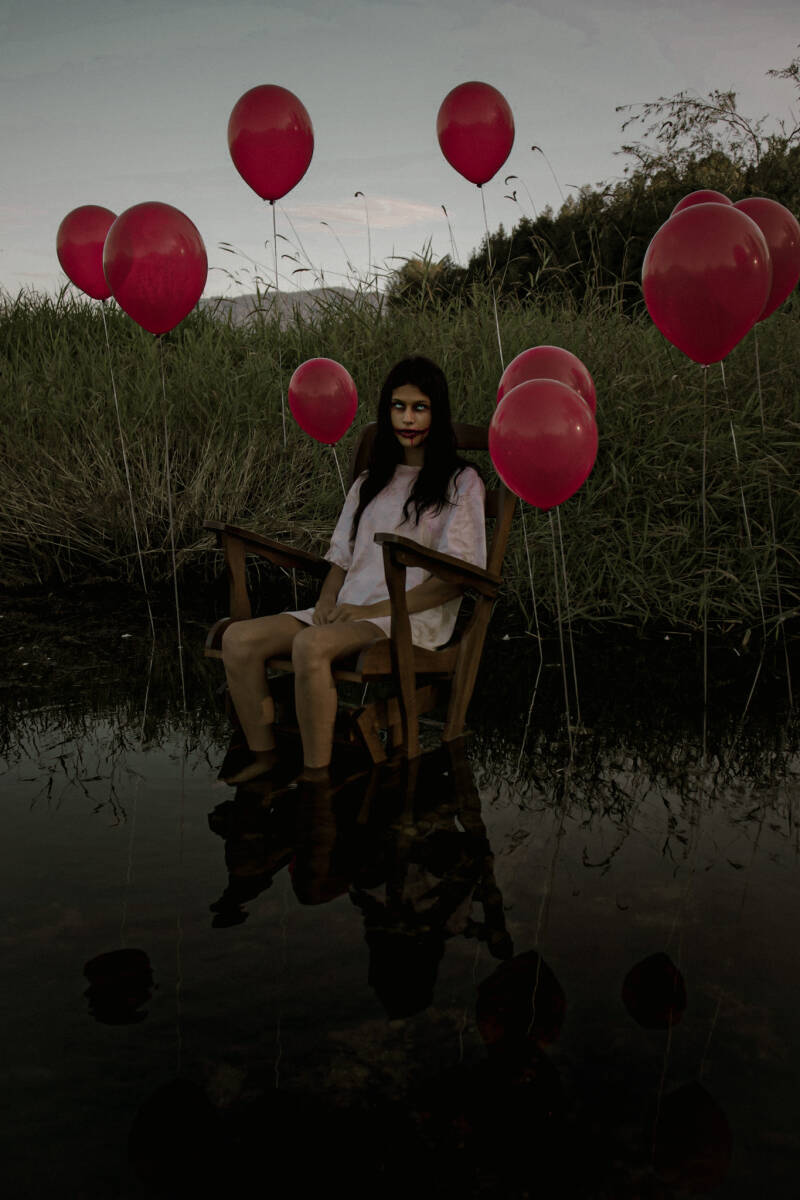 The use of the iconic horror visual of the red balloons introduces a recurring symbol of unease, whilst the character remains distant existing in a space that feels both real and unreal.