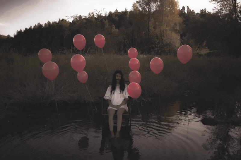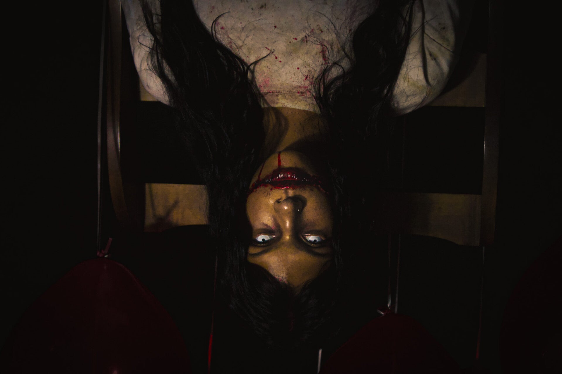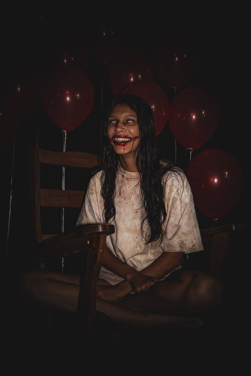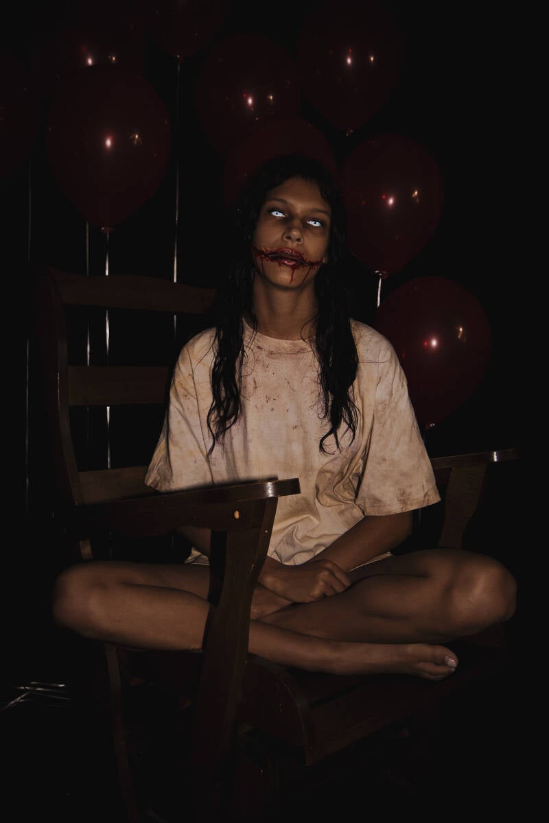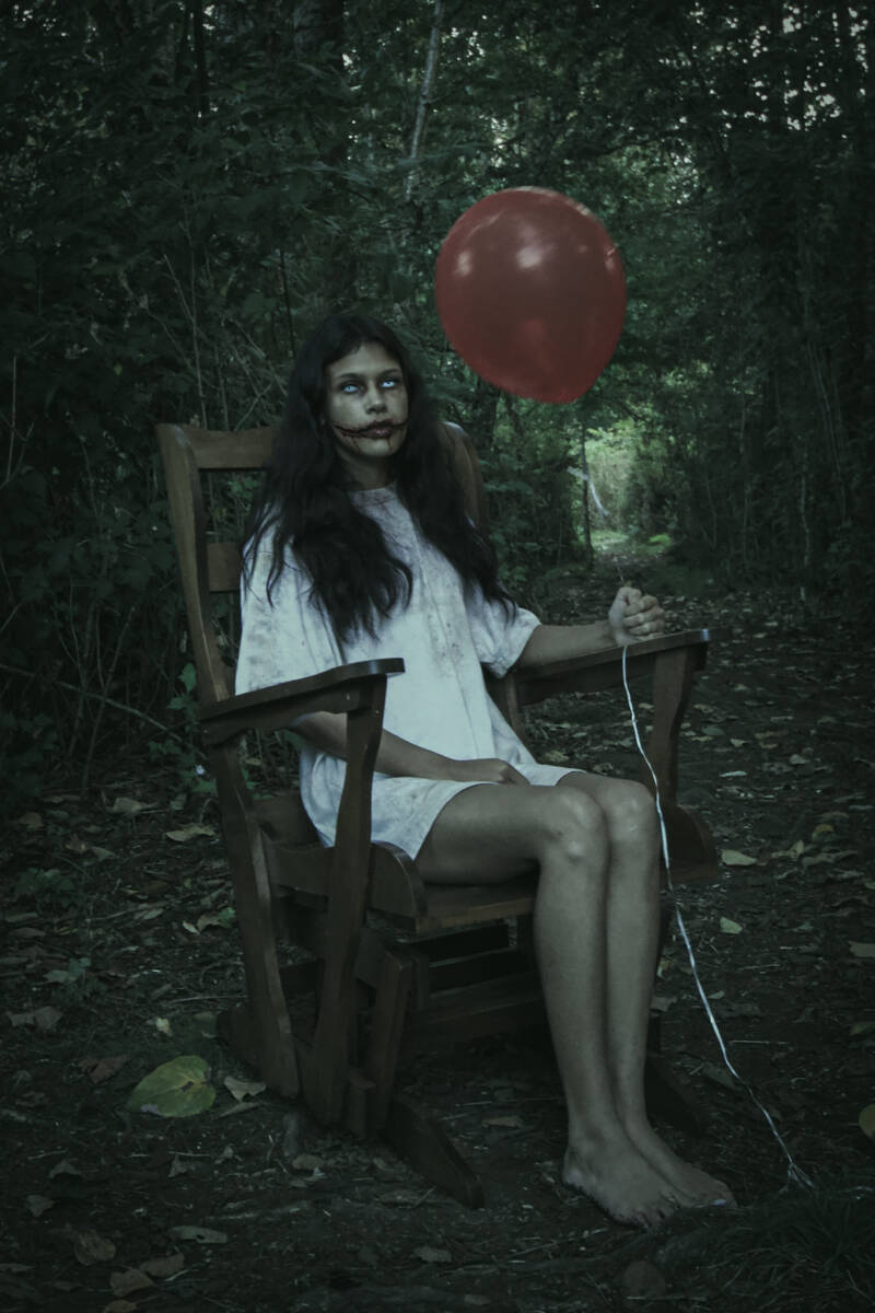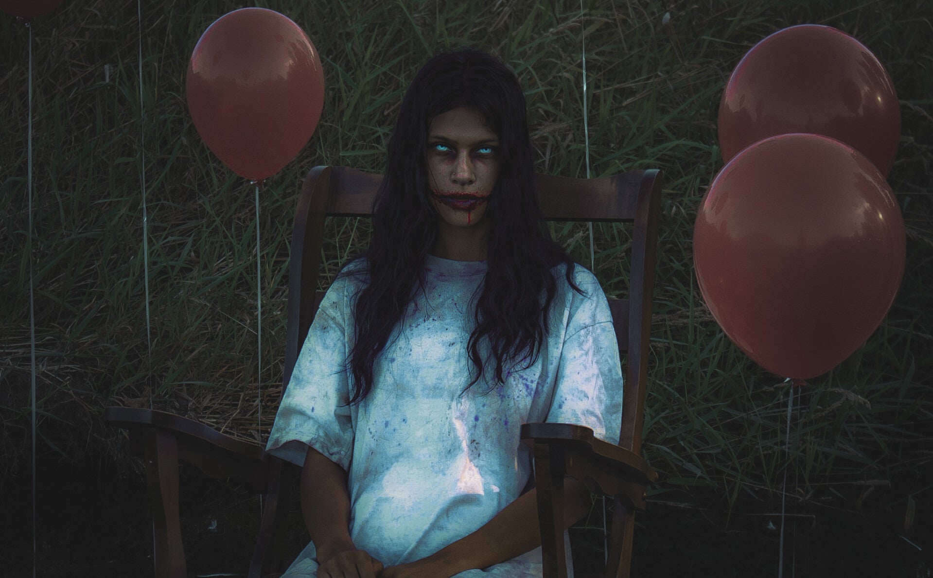 The use of the iconic horror visual of the red balloons introduces a recurring symbol of unease, whilst the character remains distant existing in a space that feels both real and unreal.