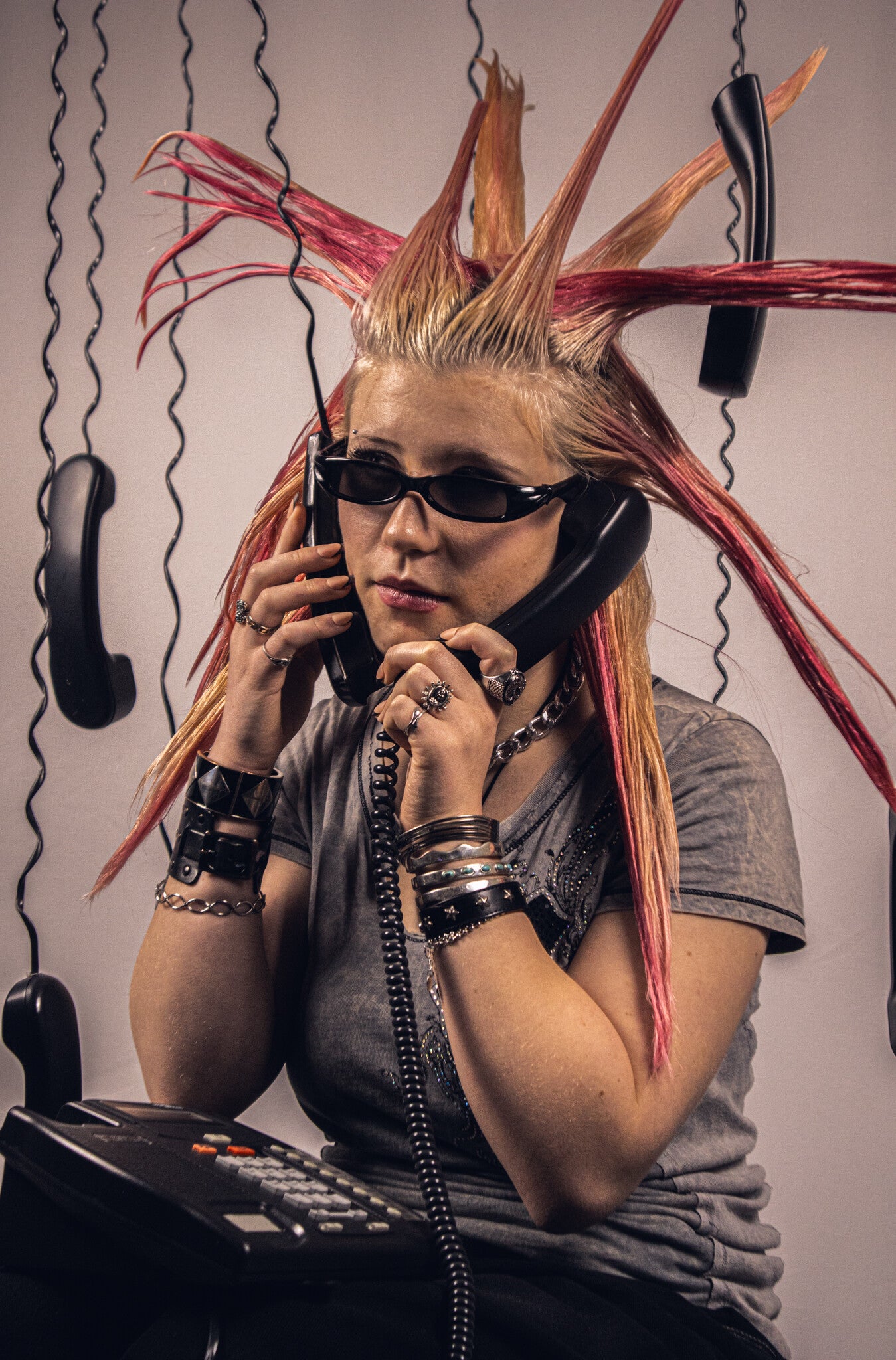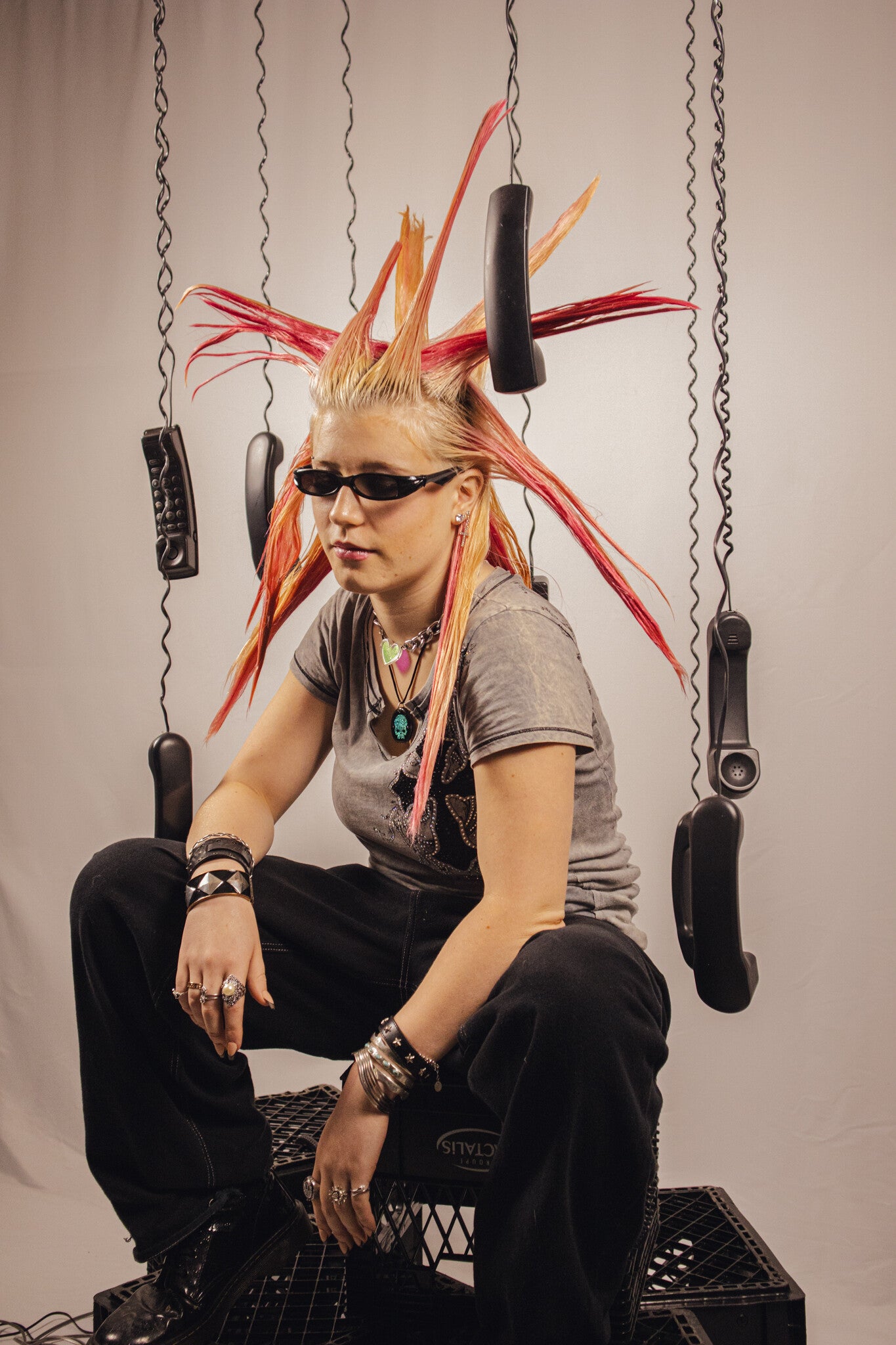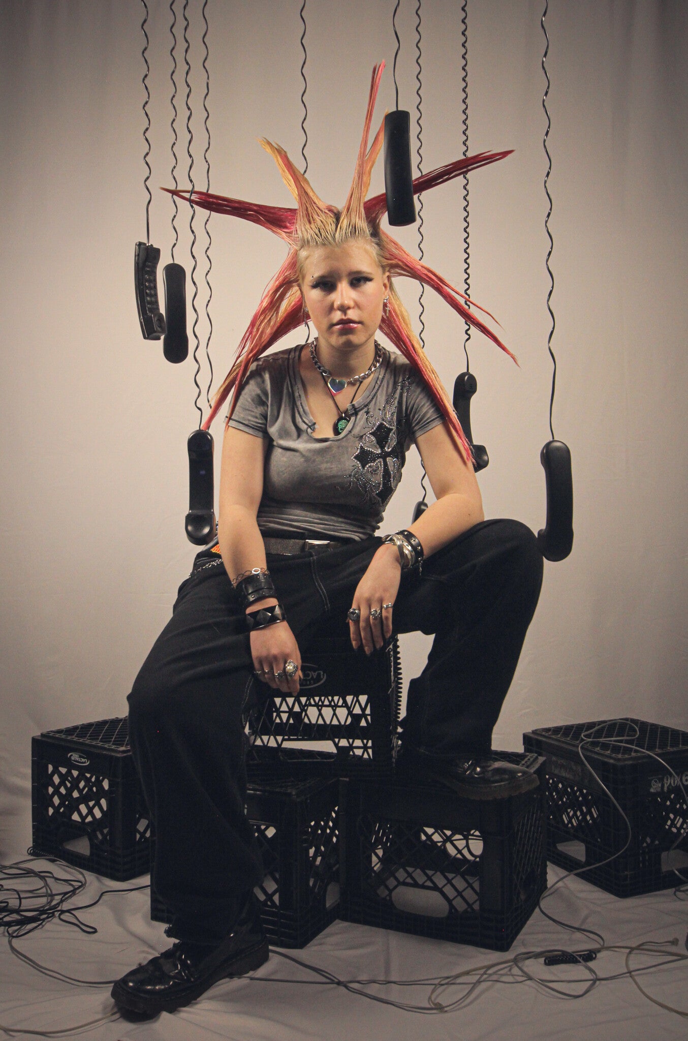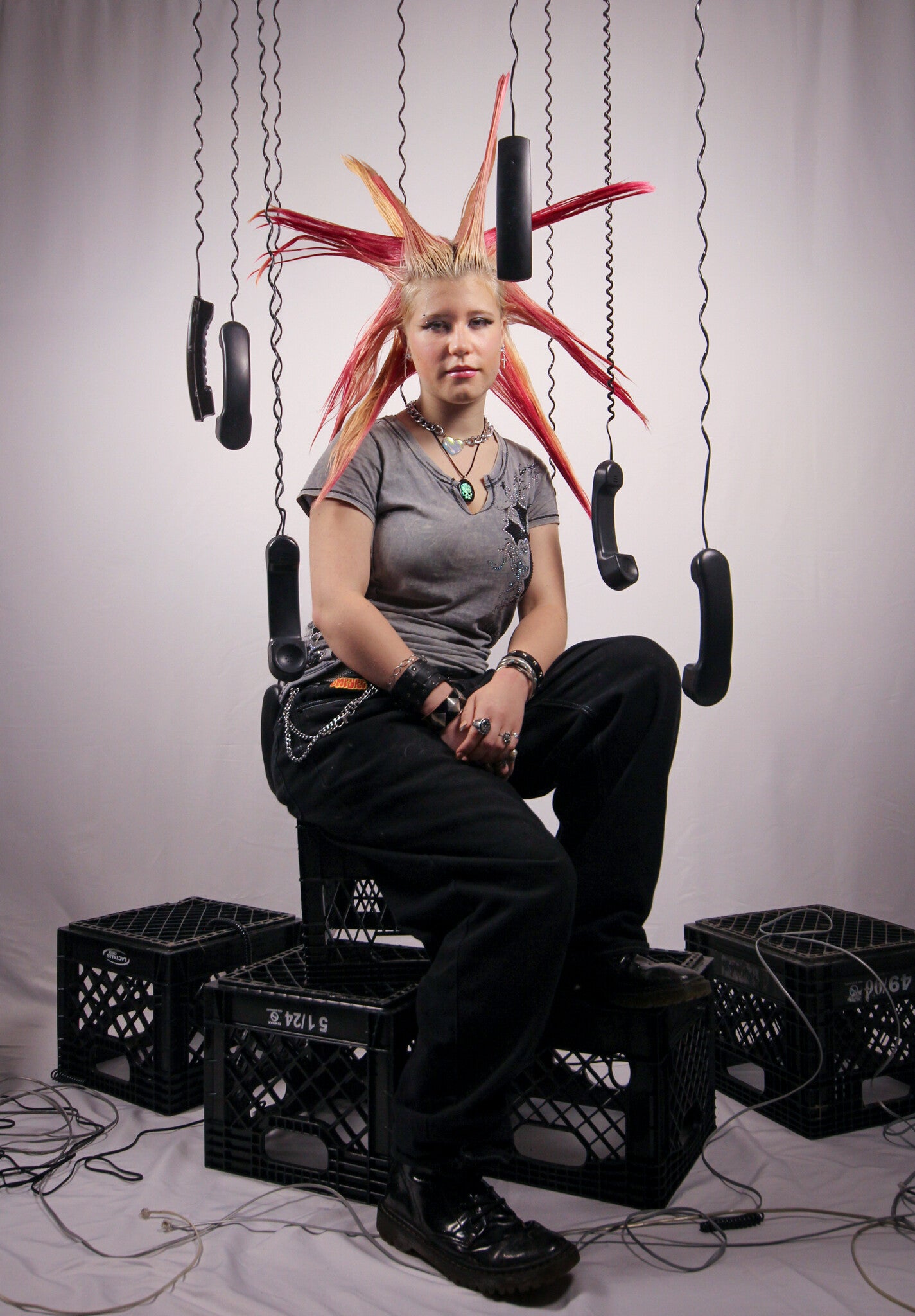 A custom built set of suspended black phones and milk crates placed against my white studio backdrop. Using the contrast between the light and dark elements creates a bold, graphic look. The arrangement plays with spacing, balance, and controlled chaos.