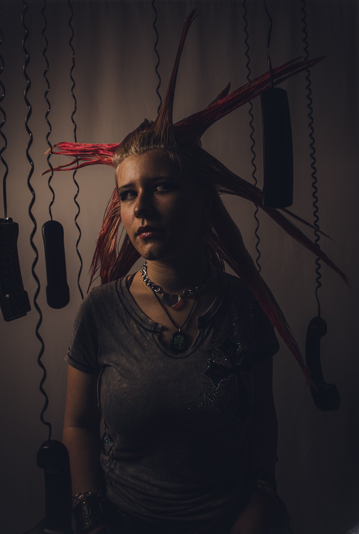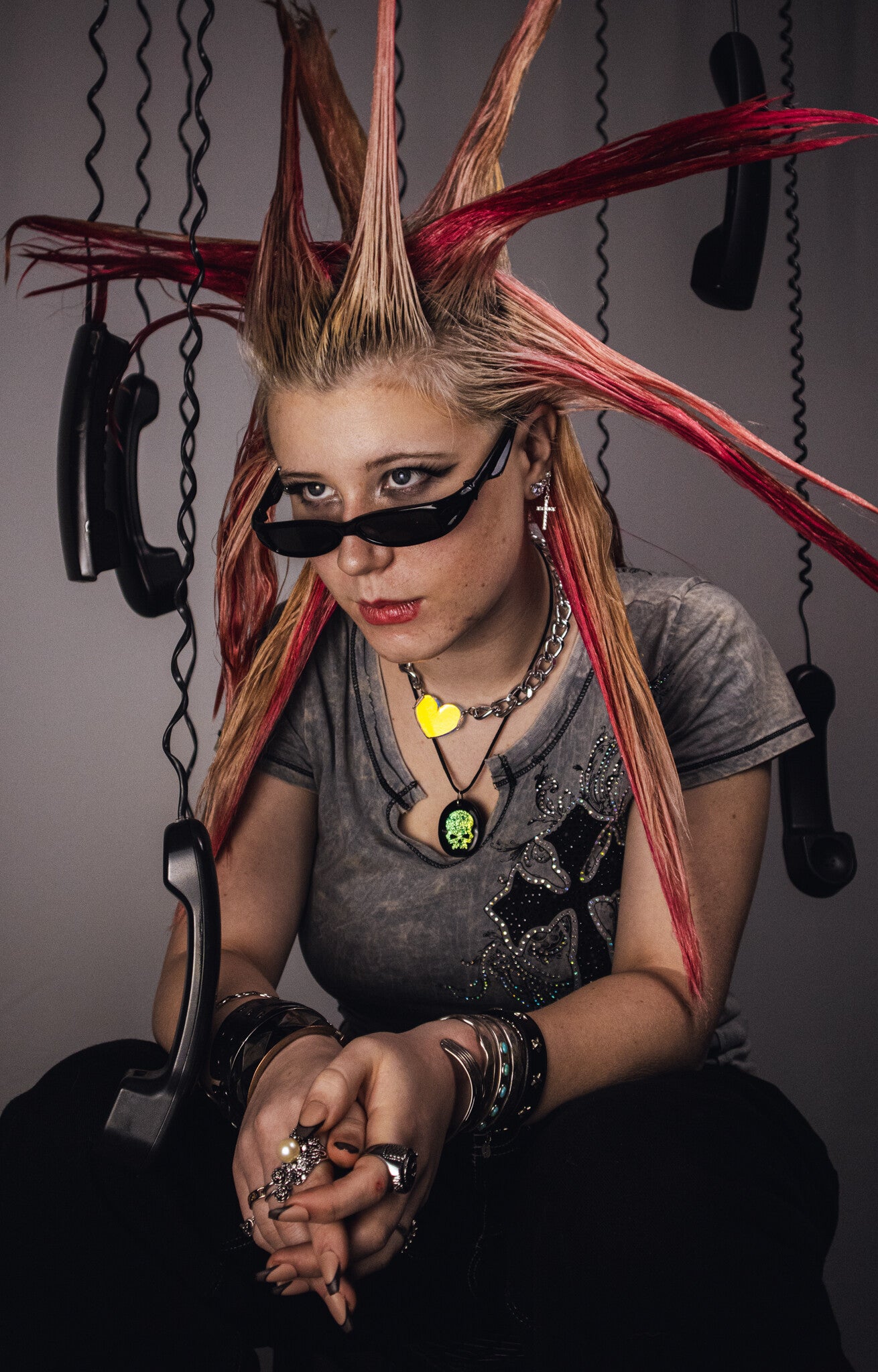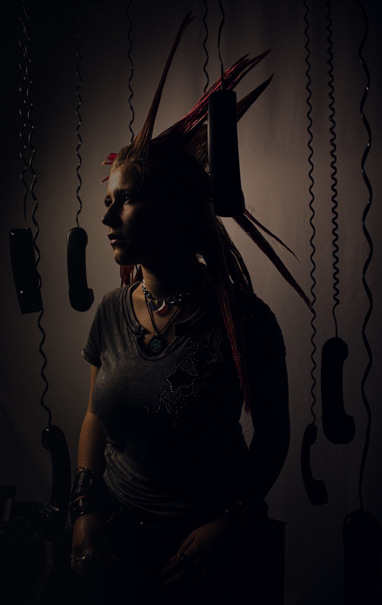 A custom built set of suspended black phones and milk crates placed against my white studio backdrop. Using the contrast between the light and dark elements creates a bold, graphic look. The arrangement plays with spacing, balance, and controlled chaos.